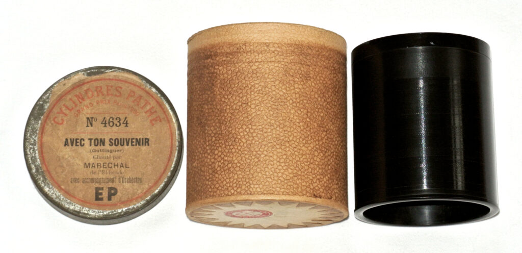 Die ansonsten hervorragend erhaltene Walze hat auf einer Seite einen geringen, aber gut hörbaren Schimmelbefall.Unbekannter Sänger mit Klavierbegleitung: Instants psychologiques, monologue très grivois (Georges de Nola). Le Kaléo-Weichwachswalze 598, um 1899/1900. Unbekannter Sänger mit Klavierbegleitung: Après la rupture (Eugène Lemercier). Le Kaléo-Weichwachswalze 4397, um 1899/1900.Gabin (Ferdinand Joseph Moncorgé): Elle m’a eu. Phonographe Populaire-Weichwachswalze, um 1900. Die abgebildete Dose gehört zu einem Titel aus Mignon.Unbekannter Sänger mit Klavierbegleitung: L’ombre. Phonographe Populaire-Weichwachswalze 446, um 1900.Henri Weber: La Berceuse bleue (Yann Nibor, Gabriel Montoya). Bariton mit Klavierbegleitung. Le Cahit-Weichwachswalze 1265, um 1902.
